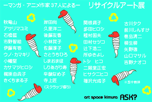 ASK?毎年恒例の久里洋二氏発案企画によるマンガ・アニメ作家によるリサイクルアート展覧会。
